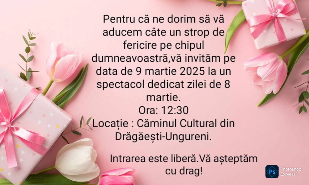 Primăria Mănești, din județul Dâmbovița, organizează, duminică – 9 martie 2025, un spectacol prilejuit de „Ziua Femeii”, la Căminul Cultural din satul Drăgăești-Ungureni. Evenimentul va începe la ora 12:30. Intrarea este liberă.