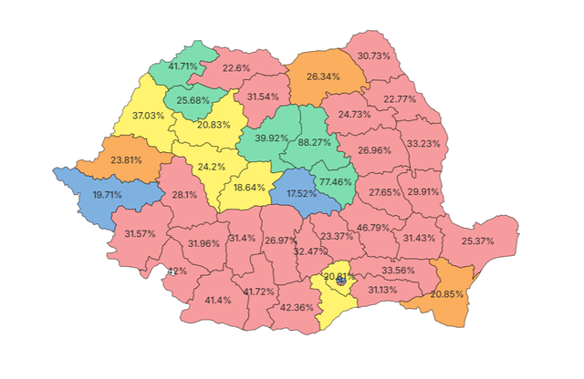 După ce au fost centralizate mai mult de 88% dintre procesele verbale, PSD se află pe primul loc în majoritatea judeţelor ţării. Doar în 16 judeţe social-democraţii nu ocupă prima poziţie, aceasta fiind împărţit de PNL, AUR, USR şi UDMR.