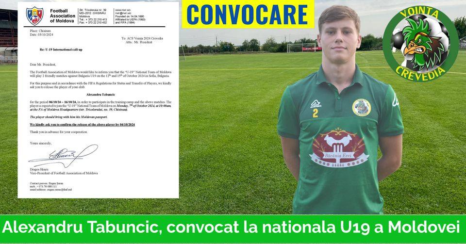 Un jucător din Liga 4 dâmbovițeană a fost convocat în națională U19 a Republicii Moldova. Este vorba de Alexandru Tabuncic (18 ani), jucător legitimat la Voința Crevedia, liderul campionatului județean. Fundașul dreapta al formației dâmbovițene va participa în perioada 6-16 octombrie la un stagiu de pregătire în Bulgaria, la Sofia, care va cuprinde și două jocuri amicale.
