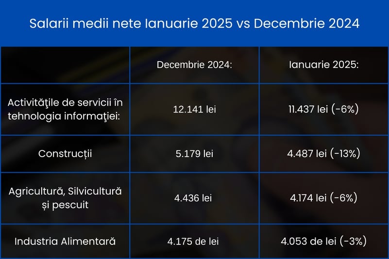 În luna ianuarie 2025, câştigul salarial mediu net în România a fost 5.328 lei, fiind mai mare cu 9,7% față de aceeași perioadă a anului precedent, dar cu 5,6% mai mic față de decembrie, arată cele mai recente date publicate de Institutul Național de Statistică. Scăderile câştigului salarial mediu net din luna ianuarie au fost determinate, printre altele, și de aplicarea prevederilor legale prin care s-au eliminat facilitățile fiscale acordate anterior în anumite…