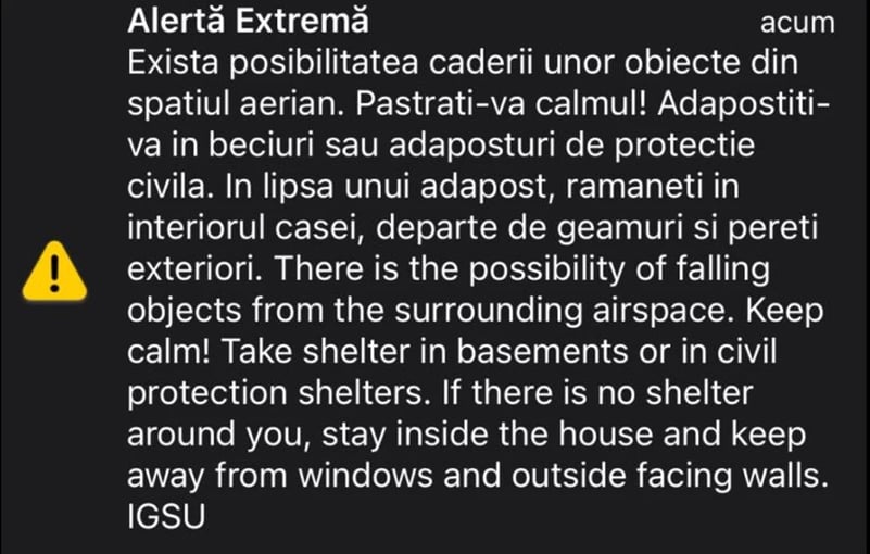 Mesaj RO-Alert pentru zona de nord a judeţului Tulcea privind riscul căderii unor obiecte din spaţiul aerian. Alerta vine în contextul unui posibil atac al Rusiei pe teritoriul Ucrainei, în apropiere de România.