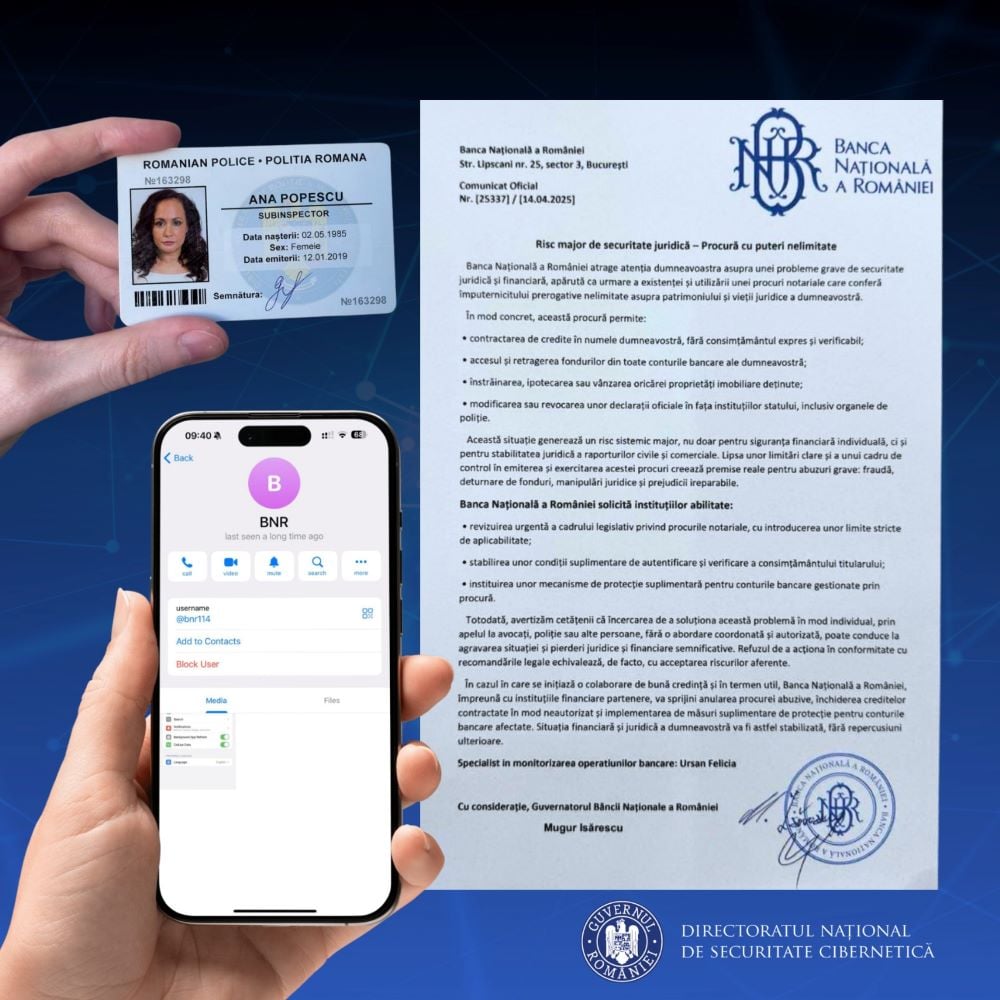 Un nou tip de fraudă a fost raportat în luna aprilie 2025, implicând apeluri telefonice care pretind a fi din partea Poliției Române și a Băncii Naționale a României (BNR). Infractorii folosesc metode sofisticate pentru a manipula victimele și a obține date bancare confidențiale. În scenariul raportat, presupusa “agentă de la poliție” susține că un infractor internațional căutat prin Interpol s-ar fi prezentat la o bancă din România și ar fi încercat să…