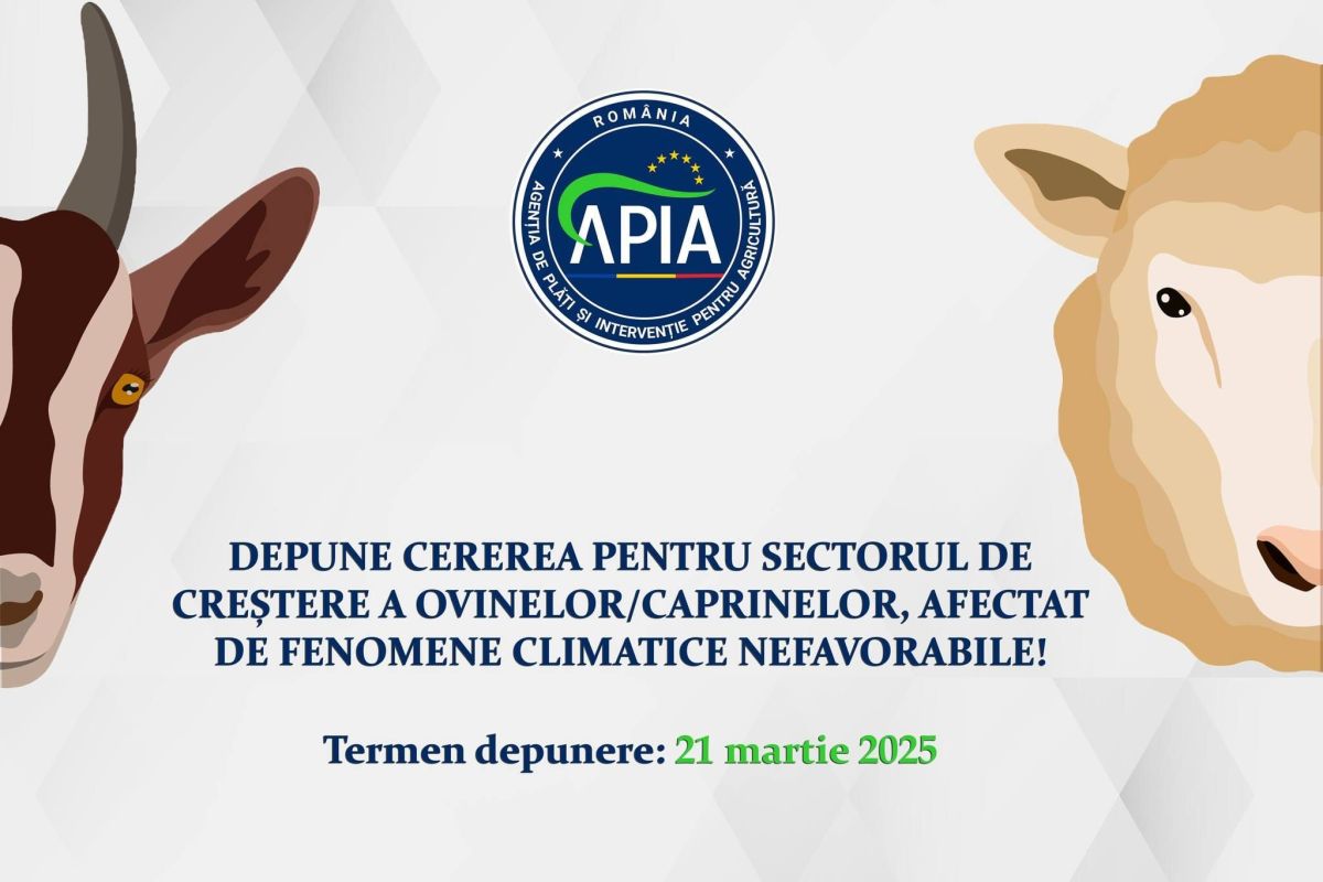 Agenția de Plăți și Intervenție pentru Agricultură (APIA) informează potențialii beneficiari că până la data de 21 martie 2025 inclusiv, primește cereri de acordare a unui sprijin financiar de urgență în agricultură pentru sectorul de creștere a ovinelor/caprinelor, afectat de fenomene climatice nefavorabile.