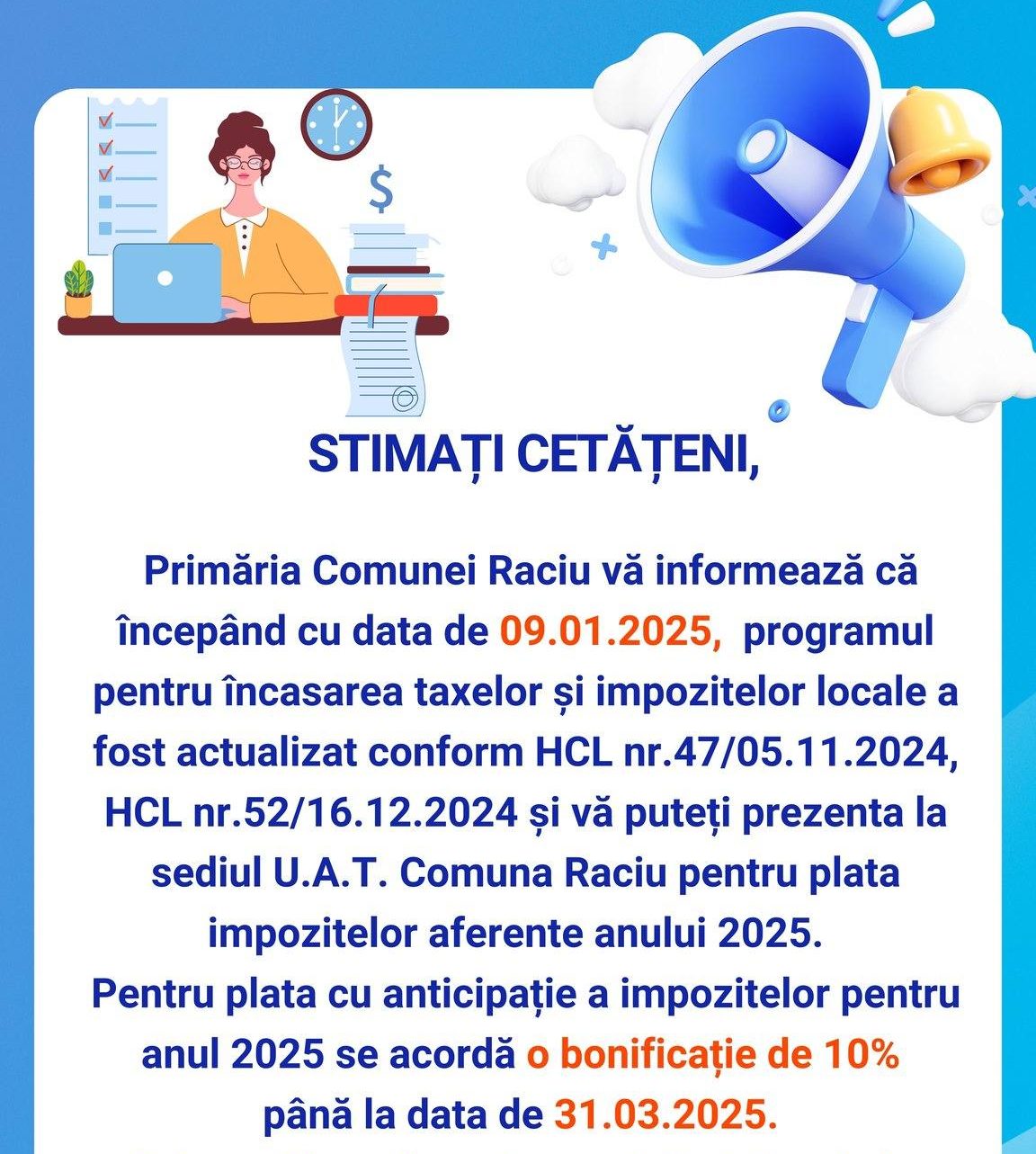 Anunț important pentru locuitorii din Raciu. Primăria Comunei informează că, începând cu data de 9 ianuarie 2025, programul pentru încasarea taxelor și impozitelor locale a fost actualizat conform HCL nr.47/05.11.2024, HCL nr.52/16.12.2024.