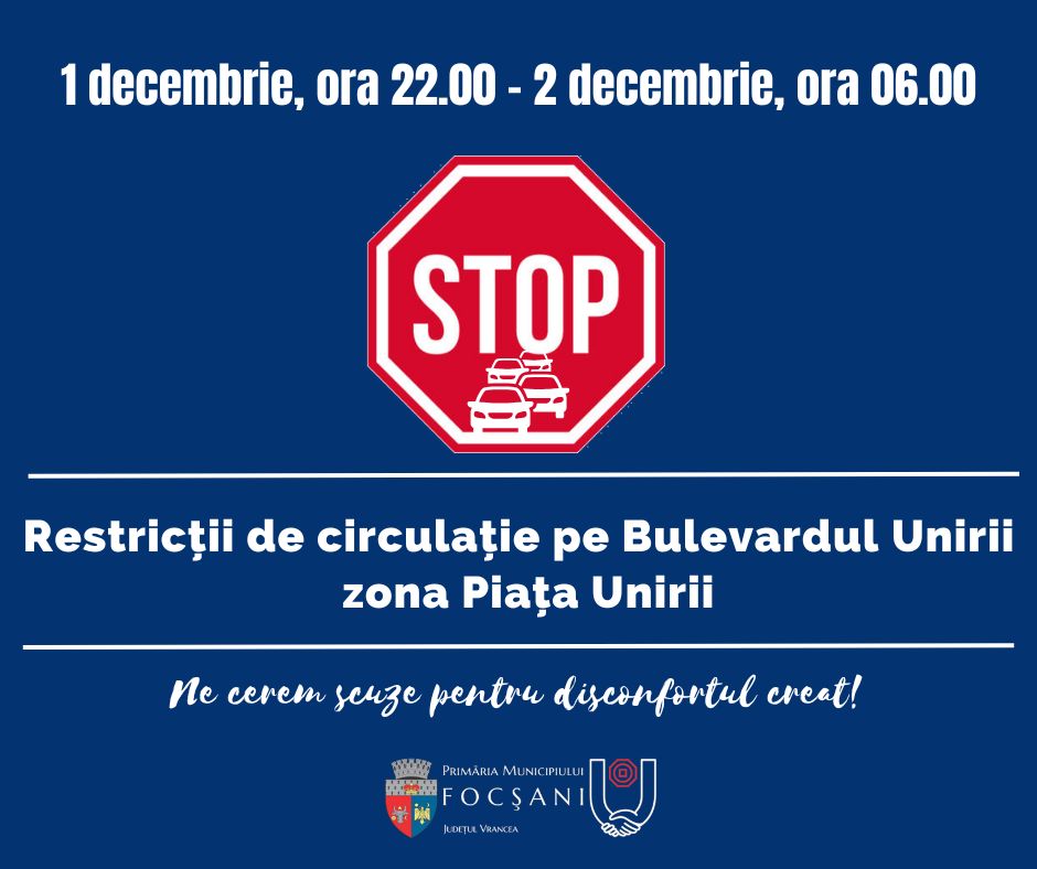 Primăria Municipiului Focșani anunță restricționarea circulației rutiere pe Bulevardul Unirii, zona Piața Unirii, duminică noapte, pentru buna desfășurare a procesului electoral. Bulevardul Unirii va fi închis pe sectorul cuprins între intersecția cu străzile Unirea Principatelor și Maior Gheorghe Pastia și intersecția cu Strada Ștefan cel Mare. Restricțiile de circulație se vor aplica de duminică, 1 decembrie 2024, ora 22:00, până luni, 2 decembrie 2024, la ora…