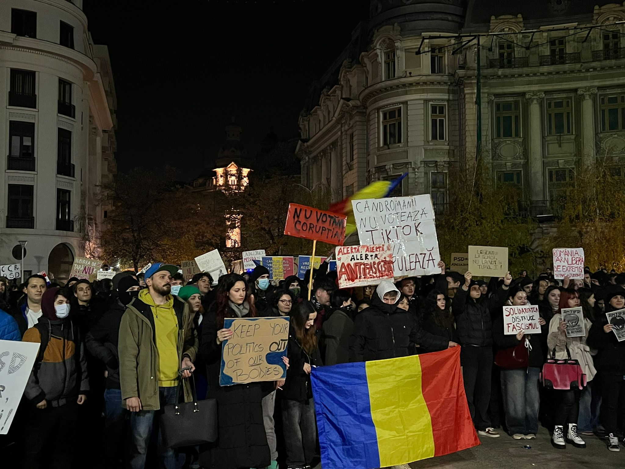 Peste 1.500 de oameni s-au adunat în a patra zi de proteste împotriva lui Călin Georgescu, în Piața Universității. În paralel, la doar câteva sute de metri, în Piața 21 Decembrie 1989, a avut loc și o adunare a susținătorilor candidatului independent, însă cele două organizații care au chemat oamenii în stradă nu s-au înțeles, iar câţiva s-au mutat în fața Teatrului Național București (TNB).