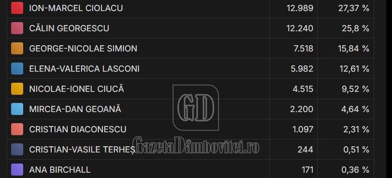 UPDATE: După centralizarea a 75% la sută dintre procesele verbale din Dâmbovița, situația rămâne neschimbată. Primele două locuri sunt în continuare ocupate de Ciolacu și Georgescu. Este foarte puțin probabil ca situația să se schimbe până la finele procesului de numărare.