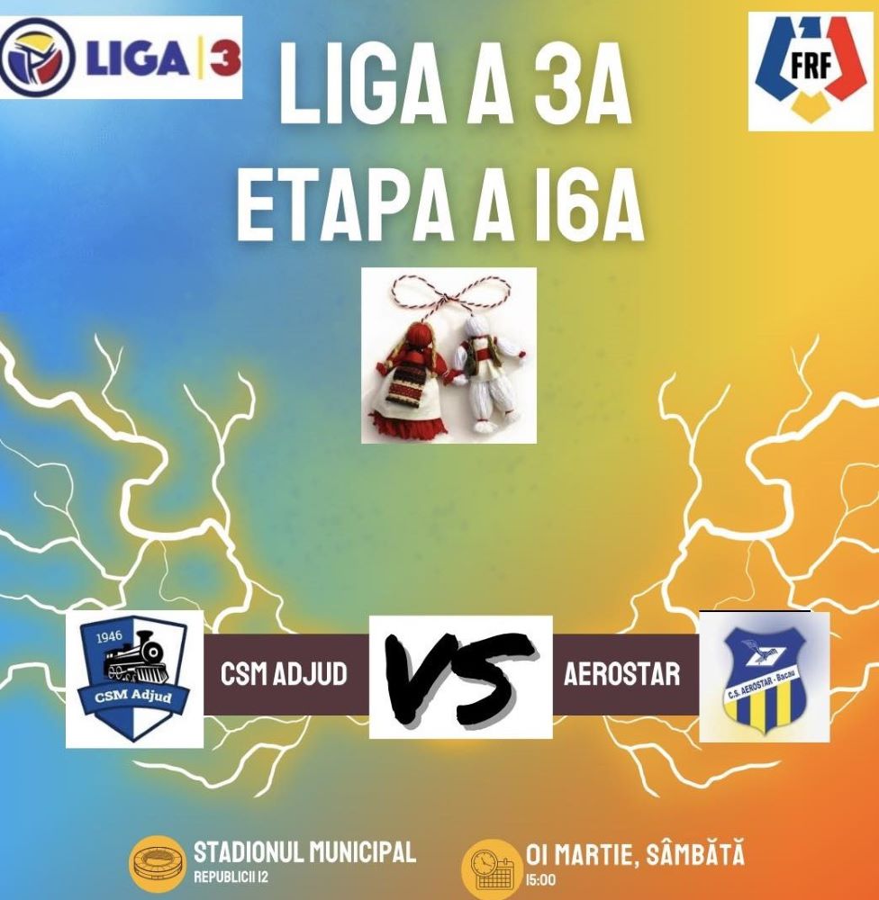 CSM Adjud 1946 joacă astăzi, pe teren propriu, primul meci oficial după vacanța de iarnă. Echipa adjudeană va întâlni pe CS Aerostar Bacău, una dintre cele mai bune echipe din acest sezon al Ligii 3 de fotbal. Echipa băcăuană este, momentan, pe locul 3, cu 30 de puncte, în clasamentul seriei a doua, în timp ce adjudenii sunt pe locul 7, cu 17 puncte. Conform organizatorilor, accesul la meci este gratuit pentru doamne și domnișoare, persoanele sub 18 ani și persoanele cu…
