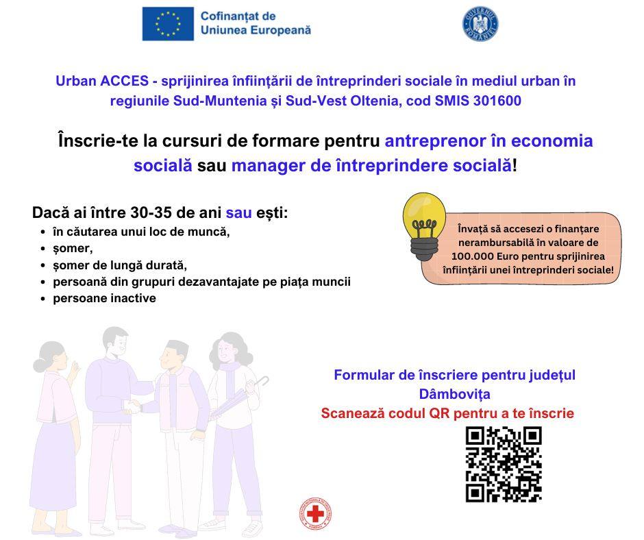 Societatea Națională de Cruce Roșie din România, în colaborare cu Asociația pentru Dezvoltare Comunitară și Servicii Sociale, implementează proiectul „Urban Acces – sprijinirea înființării de întreprinderi sociale în mediul urban în regiunile Sud-Muntenia și Sud-Vest Oltenia, cod SMIS 301600”.
