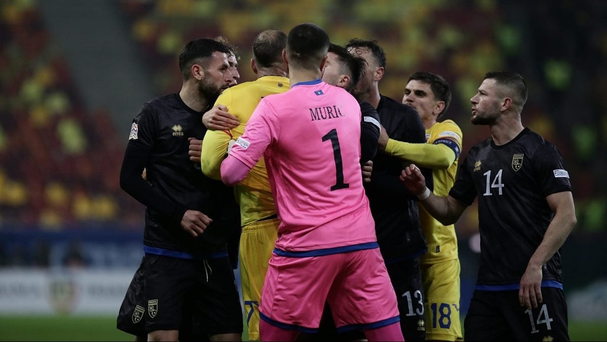 Jucătorii din naționala Kosovo au părăsit terenul cu un minut înainte de finalul meciului cu România, de la București, de vineri seara, 15 noiembrie. Fotbaliștii kosovari au plecat la vestiare la îndemnul căpitanului Amir Rrahmani și n-au vrut să continue meciul, acuzând că din tribună s-a scandat împotriva țării lor. Scorul era 0-0 în acel moment.