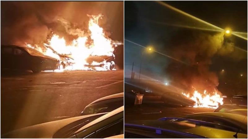 Mai multe mașini au luat foc, noaptea trecută, pe Șoseaua Gării Cățelu din București. Un martor spune că incendiul ar fi putut să pornească de la o petardă.