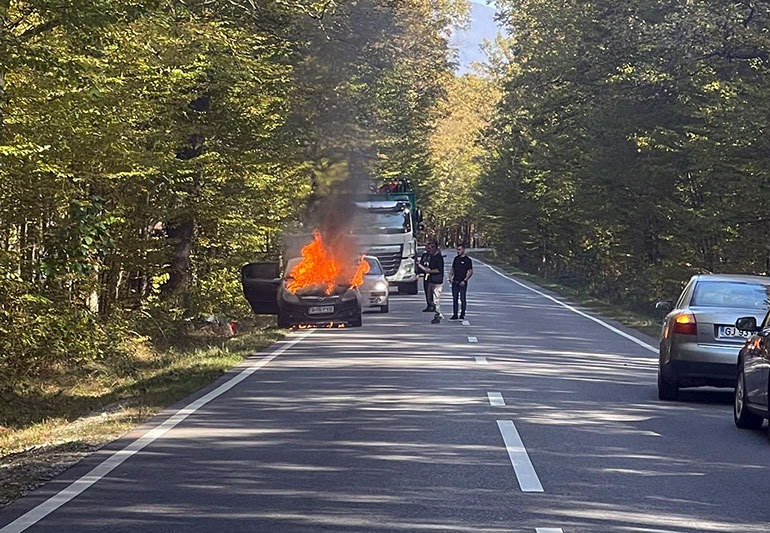 O mașină a luat foc în mers la Tismana.