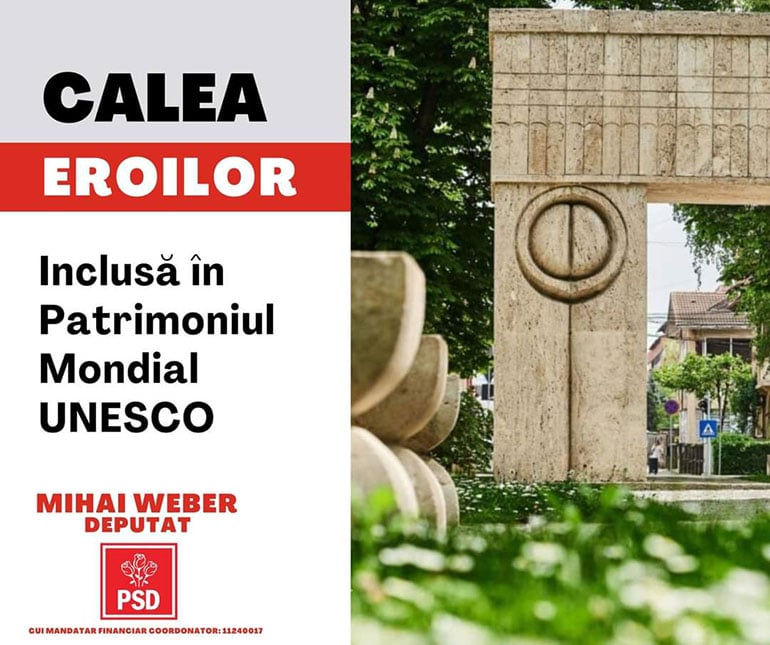 Președintele PSD Gorj, deputatul Mihai Weber a afirmat că includerea Ansamblului Monumental „Calea Eroilor” în Lista Patrimoniului Mondial UNESCO este o reușită pentru județul Gorj. În calitate de președinte al Comisiei UNESCO din Parlamentul României, Weber a subliniat că documentul care certifică acest lucru primit de autoritățile județene simbolizează o recunoaștere internațională a valorii neprețuite pe care operele lui Constantin Brâncuși o aduc nu…