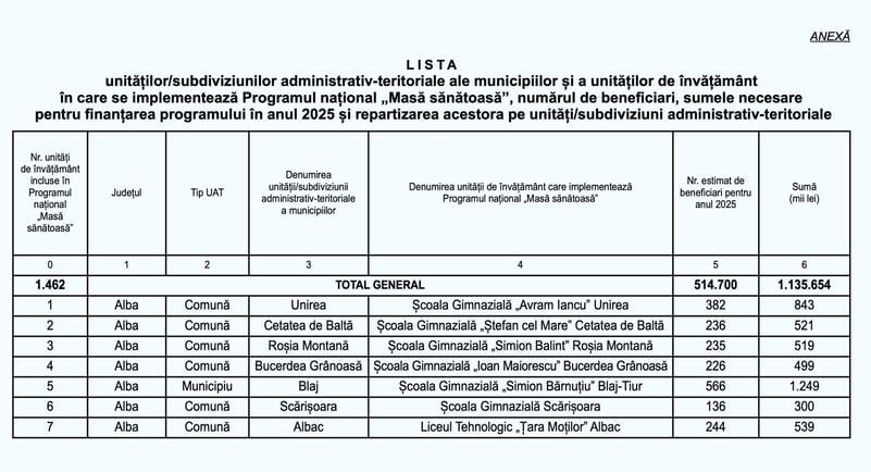 Lista cu cele 1.462 de școli incluse în programul național „Masă sănătoasă” în anul 2025, numărul de preșcolari și elevi care vor primi masa la școală și sumele necesare repartizate pe județe au fost publicate în Monitorul Oficial. Suma totală este de 1.135.654 mii lei, conform proiectului și numărul estimat de preșcolari și elevi care vor primi masa la școală este de 514.700, cu 75.074 mai mulți față de 2024, când numărul estimat a fost de 458.833…