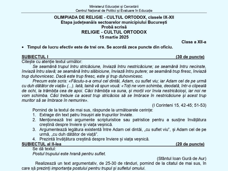 Subiectele primite de elevi la Olimpiada de Religie 2025 – Religie ortodoxă și baremele de corectare de sâmbătă, 15 martie, au fost obținute de Edupedu.ro și sunt prezentate mai jos în articol de unde le puteți descărca.