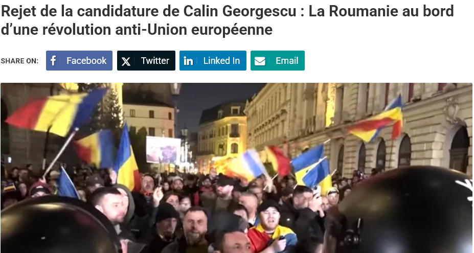 ”Ar putea deveni România prima țară care să cunoască o revoluție împotriva Uniunii Europene? Decizia de a respinge candidatura lui Călin Georgescu, un suveranist opus UE, NATO și OMS, a provocat un val de furie populară. Manifestațiile se înmulțesc, iar cuvîntul „revoluție” începe să răsune pe străzile Bucureștiului” se arată într-o analiză publicată azi de siteul media francez Reseau International.
