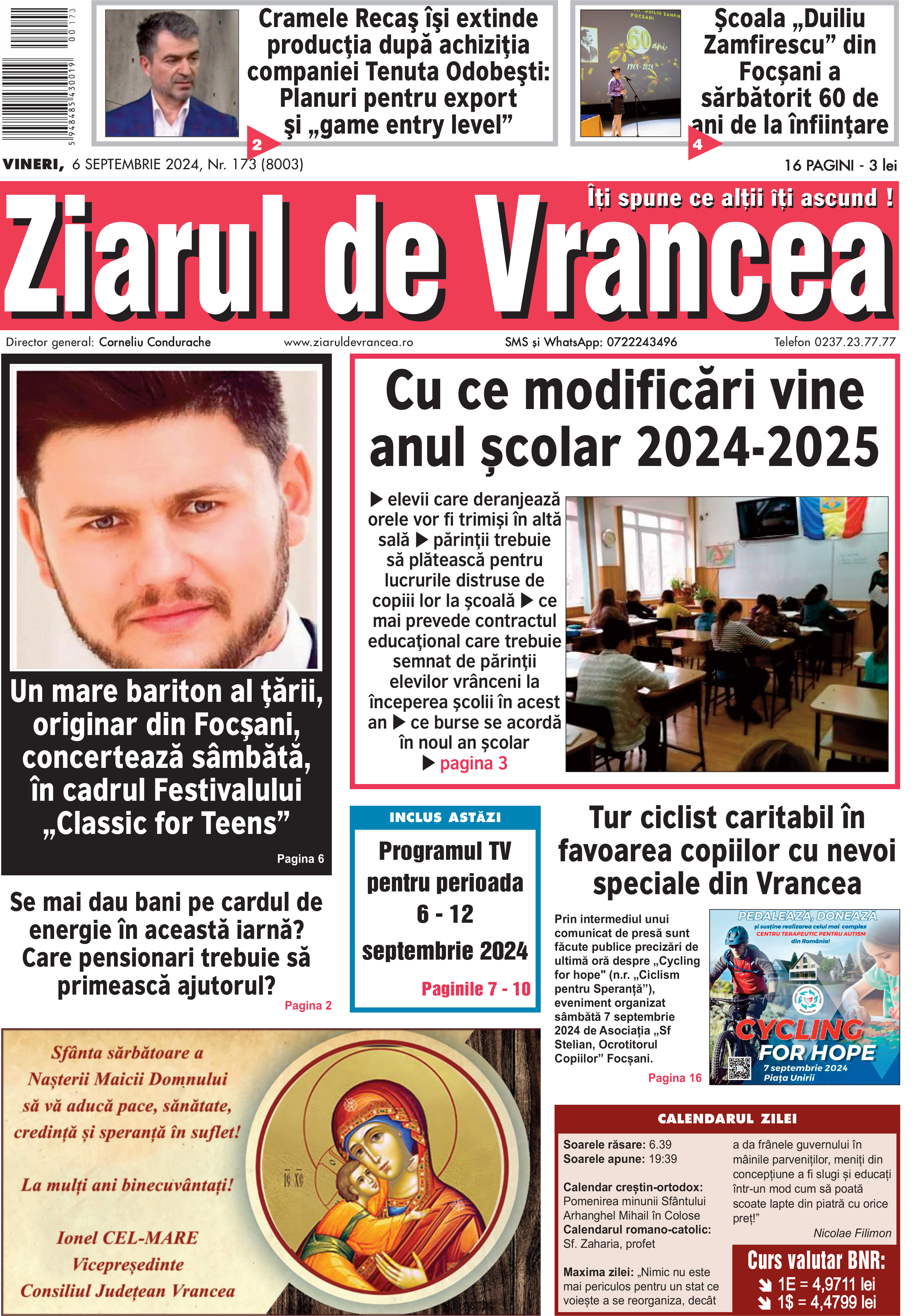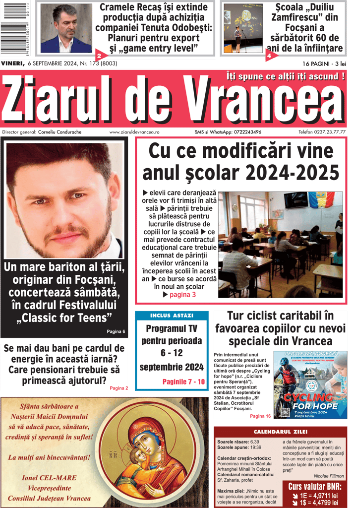 Prima pagină a ediției tipărite a Ziarului de Vrancea de vineri-sâmbătă-duminică 6-7-8 septembrie 2024