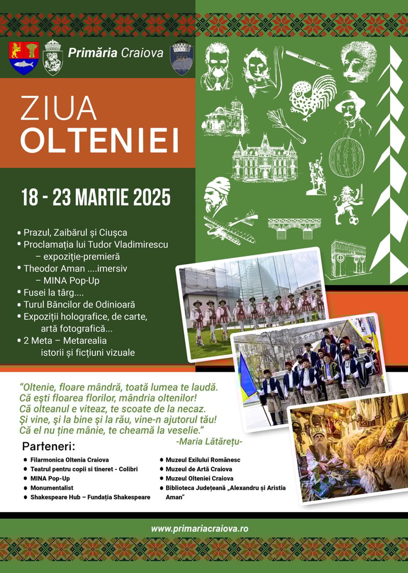 În perioada 18-23 martie, Craiova va găzdui evenimente dedicate tradițiilor, artei și culturii Olteniei, cu ocazia Zilei Olteniei. Unul dintre momentele centrale ale sărbătorii va fi lectura Proclamației lui Tudor Vladimirescu, un act istoric important din martie 1821, care va fi prezentat la Muzeul Olteniei, în cadrul unei expoziții ce include documente originale și artefacte valoroase.
