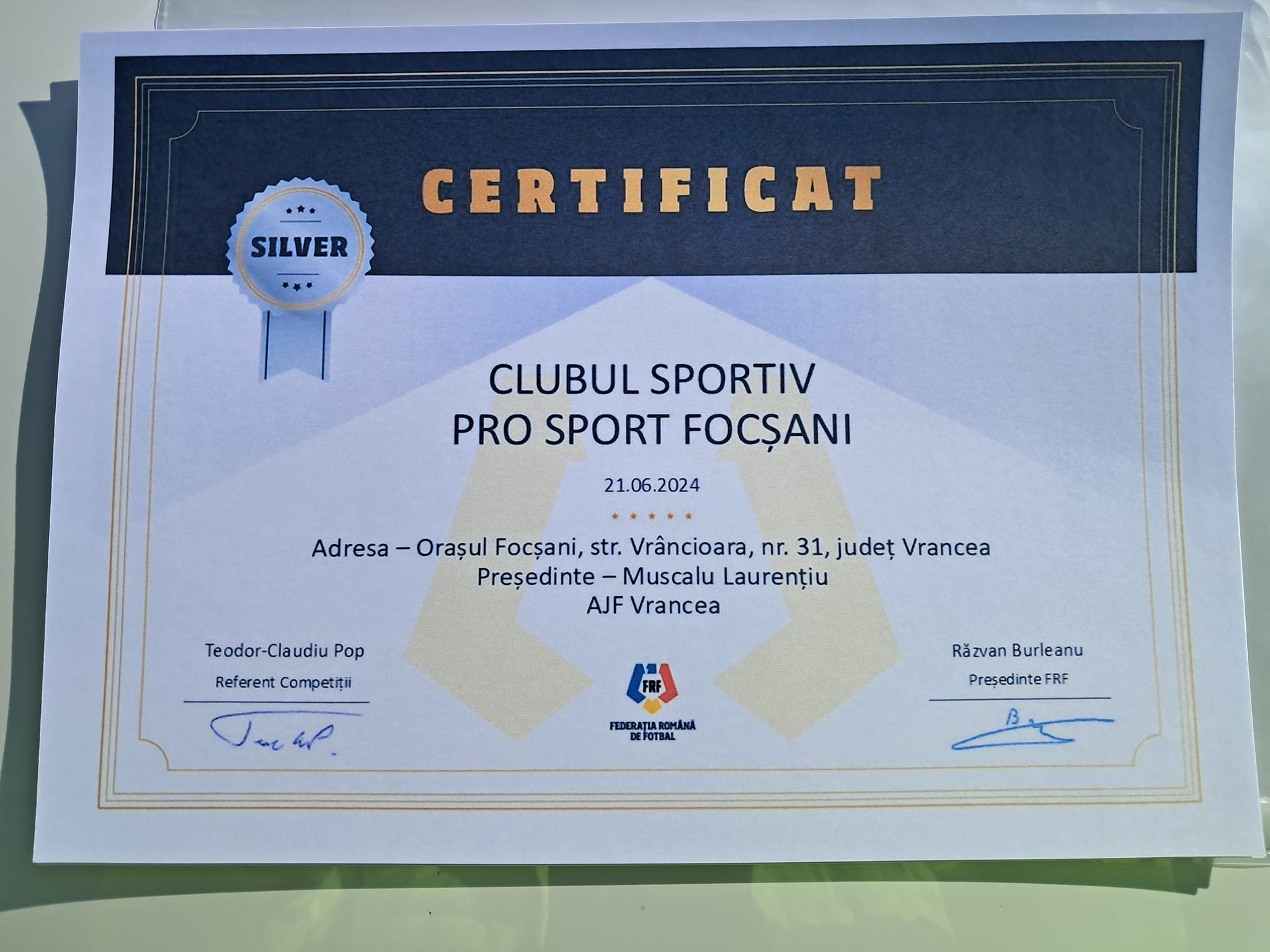 Prosport Focșani, diplomă de clasificare silver din partea FRF