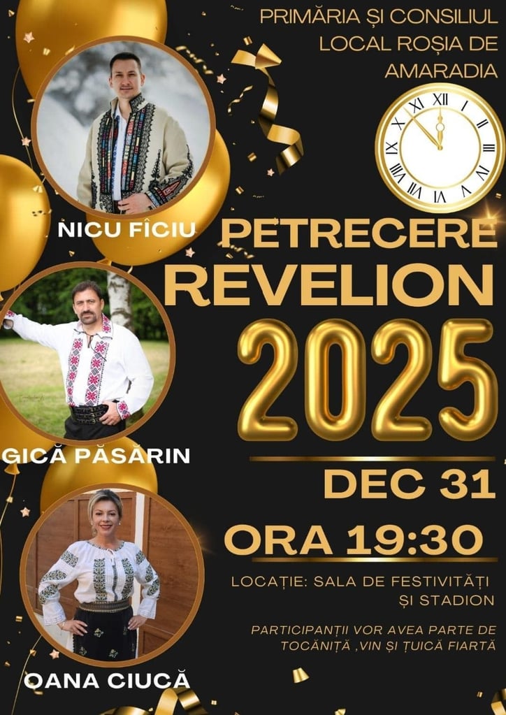 Comuna Roșia de Amaradia va găzdui o petrecere de neuitat în noaptea dintre ani, iar autoritățile promit o seară plină de surprize. Începând cu ora 19:00, pe stadionul din centrul localității și în sala de festivități, toți localnicii sunt invitați să petreacă alături de cei dragi și să întâmpine noul an în stil tradițional.