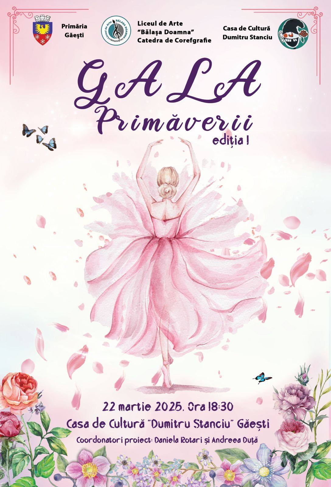 Secția de Coregrafie a Liceului de Arte „Bălașa Doamna”, în parteneriat cu Casa de Cultură „Dumitru Stanciu”, din Mun. Găești, va organiza prima ediție a spectacolului „Gala Primăverii”, în data de 22 martie, ora 18.30. Momentele artistice vor fi susținute de elevii clasei de Coregrafie a Liceului de Arte „Bălașa Doamna”, elevii Studioului de Balet și dans „Pirouette” și elevii școlii „Daniela Rotari Ballet Dance Studio”.