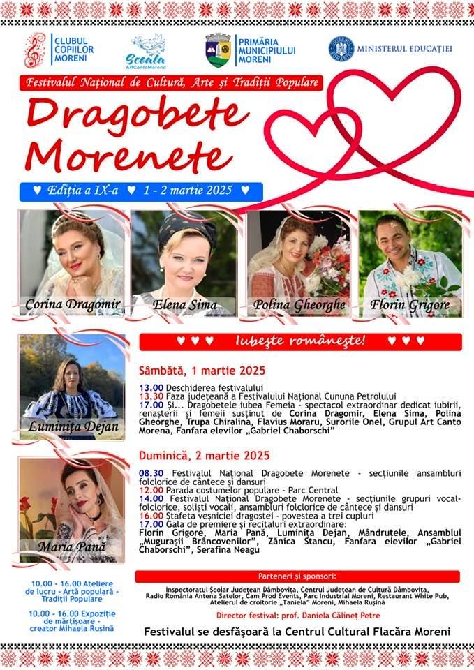 În perioada 1 – 2 martie 2025, municipiul Moreni va fi gazda celei de a IX-a ediții a Festivalului Național de Cultură, Arte și Tradiții Populare „Dragobete Morenete”, un veritabil reper pentru promovarea, încurajarea și sprijinirea talentelor autentice românești. Potrivit primarului municipiului dâmbovițean, în acest an, vor concura peste 300 de participanți din țară, la secțiunile: soliști vocali, soliști instrumentiști, ansambluri folclorice, grupuri și dansuri…